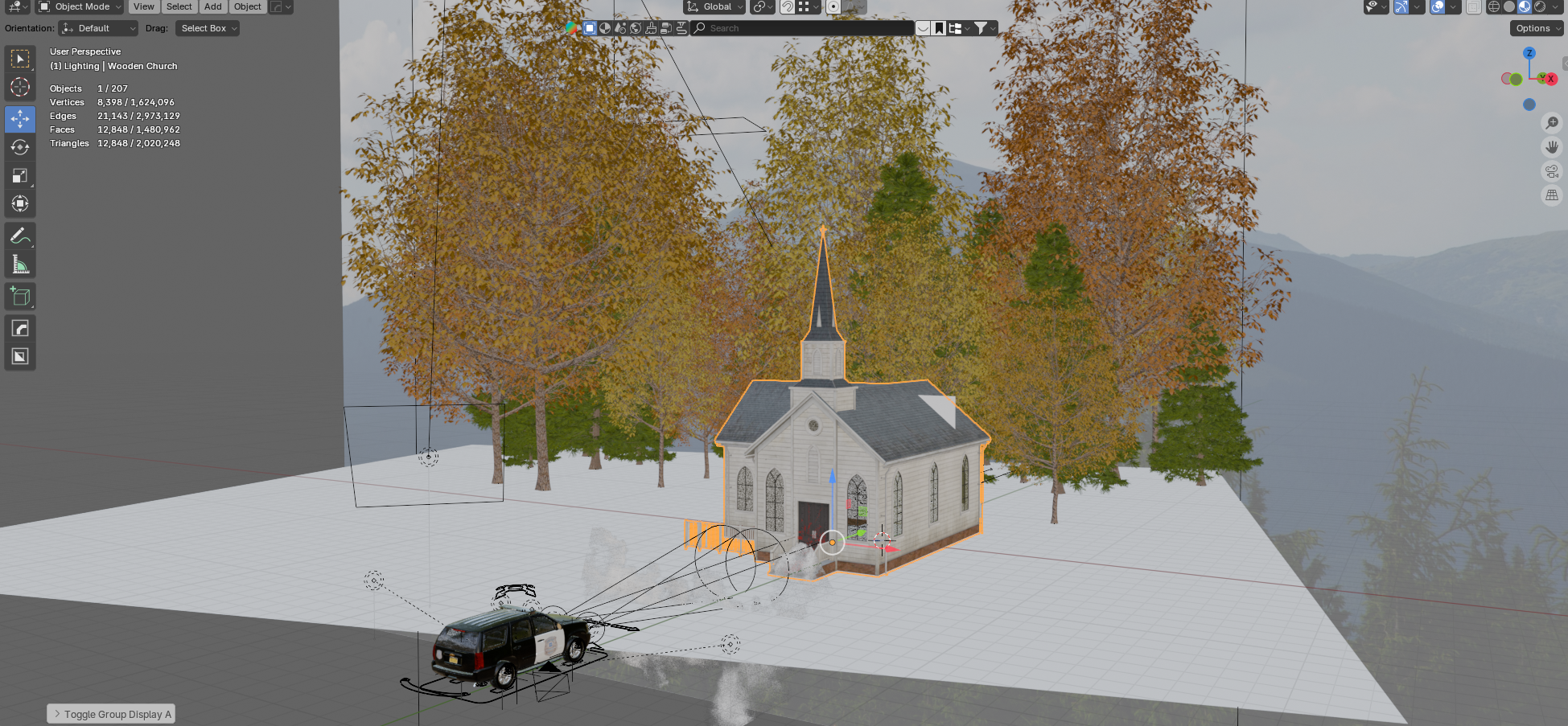 These are the lights I thought I’d need to make this scene do what I wanted it to do. There are the lights on the car, of course: two headlights, two lights on the top bar, red and blue, with two additional lights on either side to provide some extra glow on the ground, the church, and the trees — none of which is actually noticeable in the render. There’s a green, glowing light inside the church to provide that otherworldly insinuation, but ends up looking like someone left a really bright 1980’s era CRT turned on. The environmental lights aren’t even doing their jobs. Technically, most of the light is coming from that massive round spot light, but the underside of the trees was dark so I threw on a small area light, and the outlines of the trees weren’t coming through so I put another area light behind them in hope of providing some glow. In the end, there is both too many lights and somehow not enough lights, or rather, none of the lights that are present are working well enough to give me what I want, leading me to realize that it’s not Blender’s fault. It’s not the lighting’s fault. It’s certainly not Max Hay’s fault. It’s my fault: I cannot figure out how to deal with lighting in Blender.