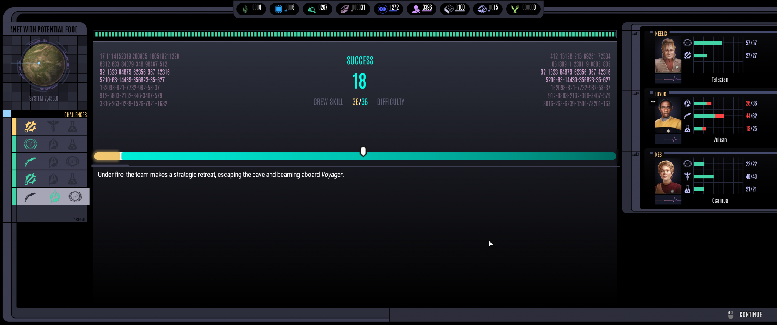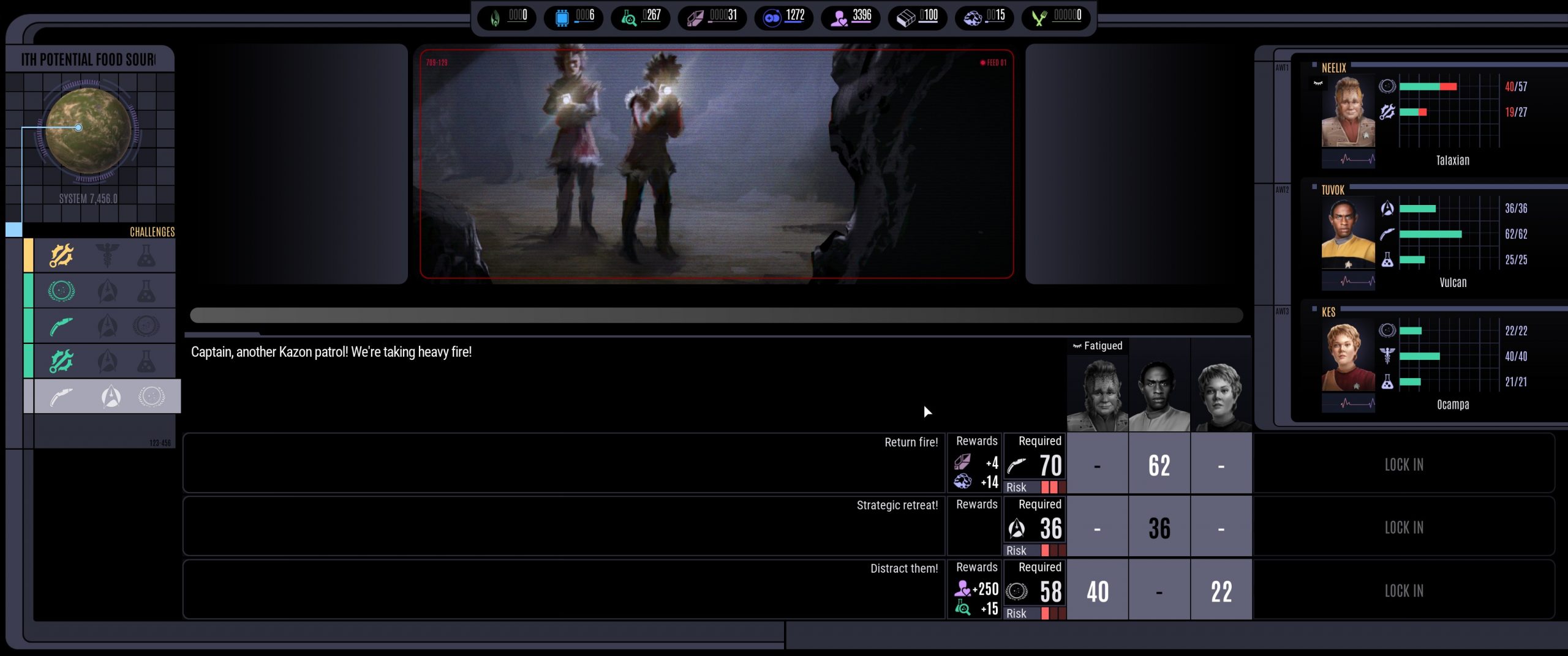 Once in the mission, each scene will provide up to three different options. We choose one or more crew members whose specialization can beat the proscribed difficulty. Each option can also provide us with some benefits such as duranium or crew morale. At the end of the mission, the away team earns XP and whatever they can carry back to the ship.
