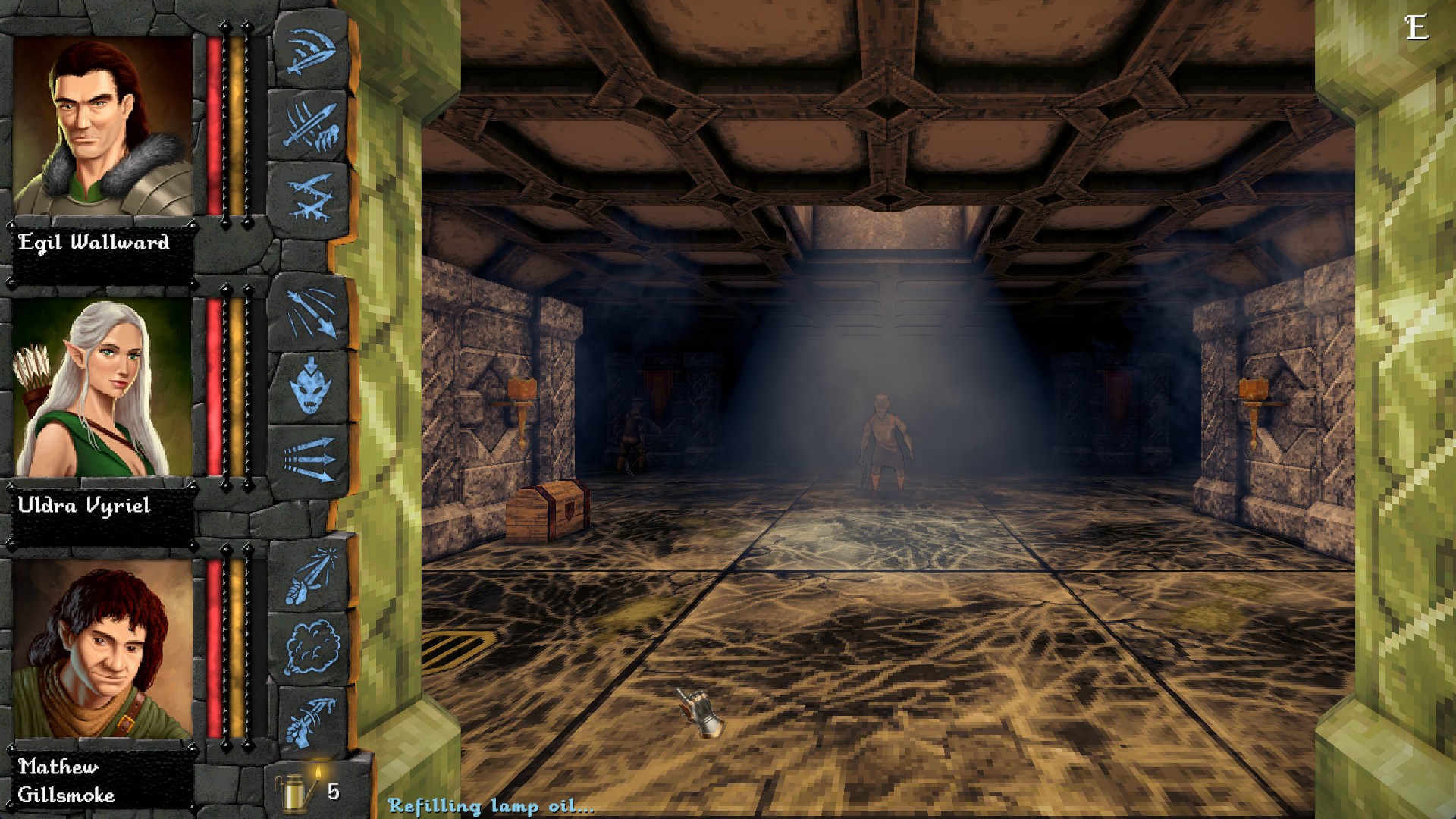 Once I descended into the dungeon, the UI is minimal. There’s the 3D viewport front-and-center, and my party on the left. Each of their three skills are available for when I need to use them. Combat is turn based, it seems, depending on an internal and unseen motivator; walking up to an enemy allowed me to roll through all three of my member’s actions (one per round) before the enemy got to attack. The first room, however, was just lousy with enemies, and I was getting attacked from front, left, and right at the same time. Enemies who flank get to hit on their own time as I apparently needed to be facing them to get any actions of my own. Poor Uldra died at the foot of the goddamn stairs leading up to the lobby. I could have gone back up to replace her, but at this point I was sighing heavily and decided to just see how far I could get before uninstalling.