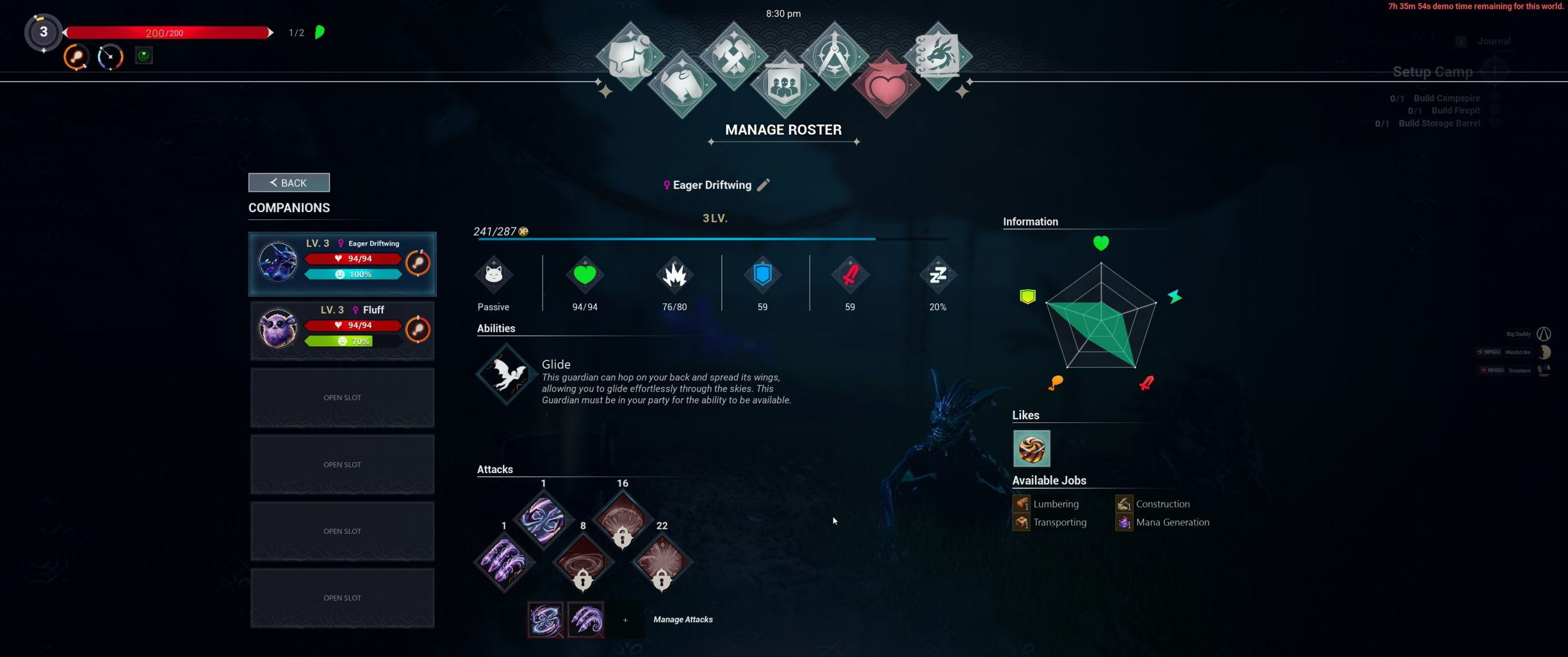 I have yet to deploy my critters beyond the hang glider, but they can be used in battle, and I was told by the instruction bird that once I set up my camp, I can put my animals to work, a la Palworld, although the bird introduced this aspect by first telling me to build them beds so they can rest and not get disgruntled. I’m interested to see how this plays out in GotWS since in Palworld, the Pals have a somewhat comical design to many of them, which kind of makes the whole “indentured servitude” take a little more light-hearted. Here, the Guardians can get pretty no-nonsense from what I’ve seen, so it might feel a little more like a chain gang if they’re constantly scowling at me even after I give them a pet bed to sleep in.