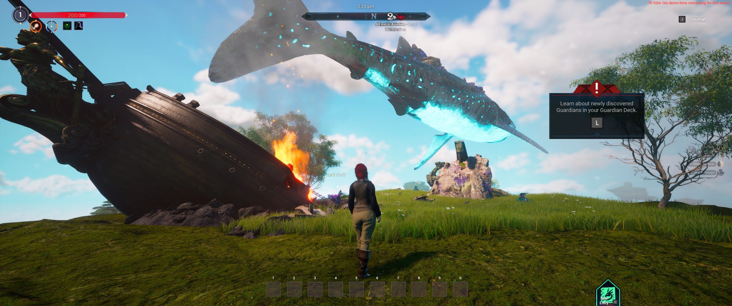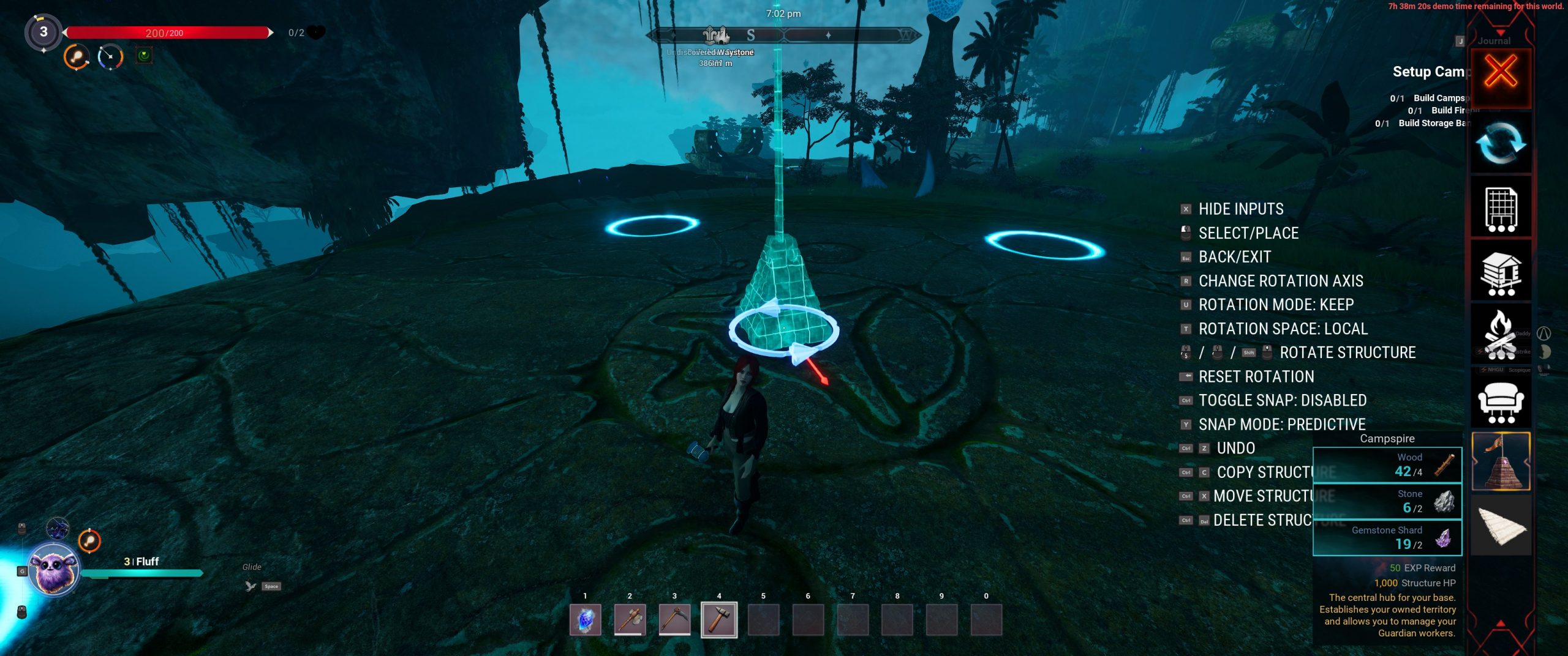 Next, the interdimensional tut-oriole told me to set up a base, so I collected more materials, unlocked some additional recipes using the skill points I had earned by leveling up, a la A.R.K., Conan Exiles, and other well known survivalbox games, and threw down my land ownership claim flag and a campfire.