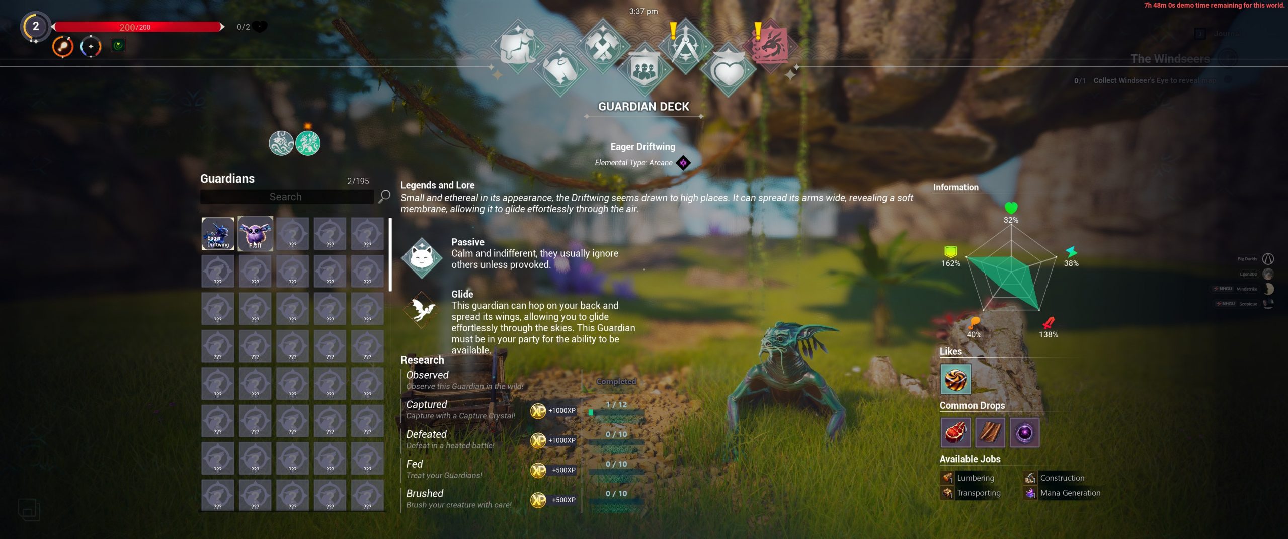 I snagged the Fluff and the Eager Driftwing as those were the only two in the area. The driftwing acts as my glider, so not only could I eventually get back onto a sky ship, but I could hang-glide between islands. First, though, I had to ride the whale.