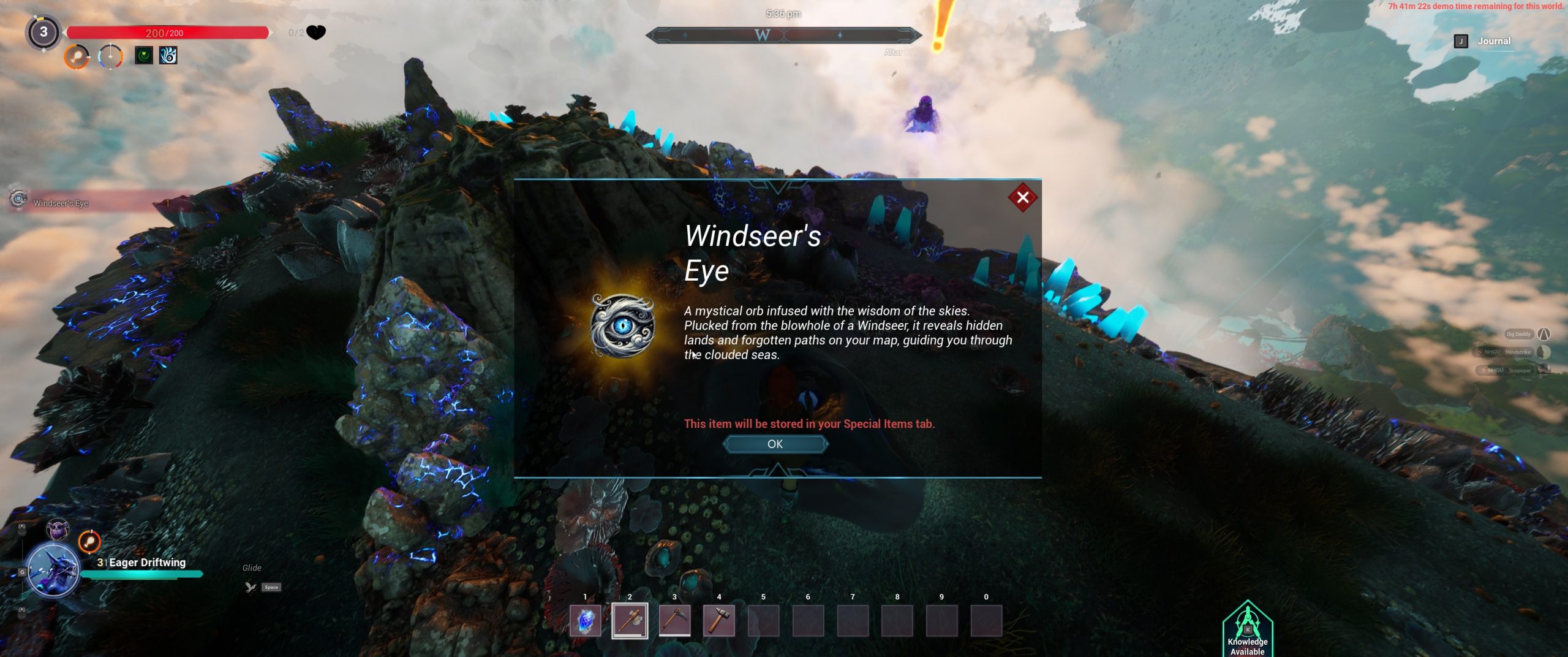 Flying above me was a massive sky whale. Using the drifting and nearby updrafts, I managed to get on the back of this thing to collect the “Windseer’s Eye” which pushed back the fog of war in my immediate area on the map.
