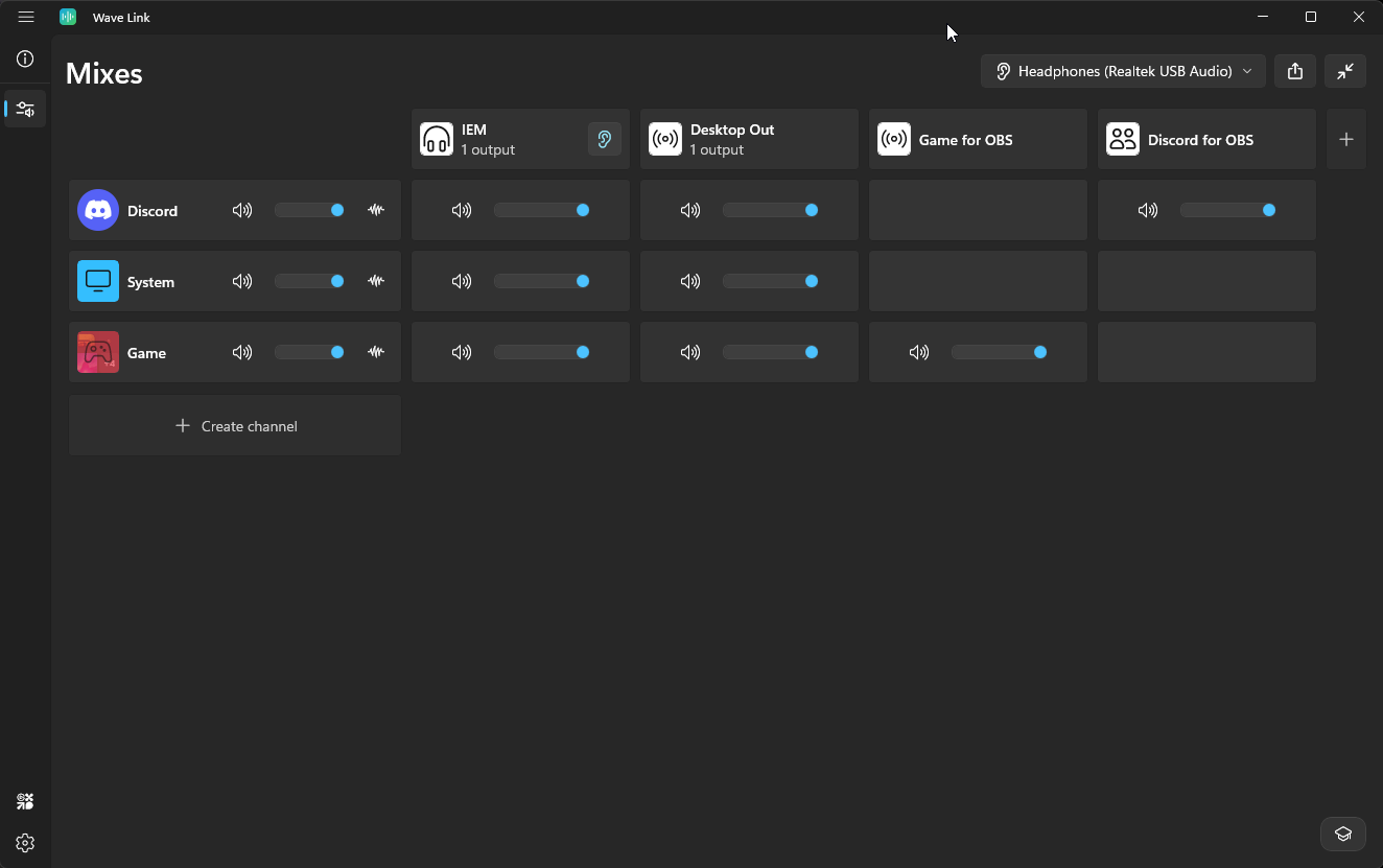 Once I had all of my audio inputs defined, I could then set up output routing. Wave Link can define up to five different output routes, and each route can contain as many or as few of the defined audio sources as needed. In my case, I had four defined: IEM for listening through the earbuds, Desktop Out for my soundbar, Game for OBS to handle game audio when recording, and Discord for OBS to handle Discord audio when recording.