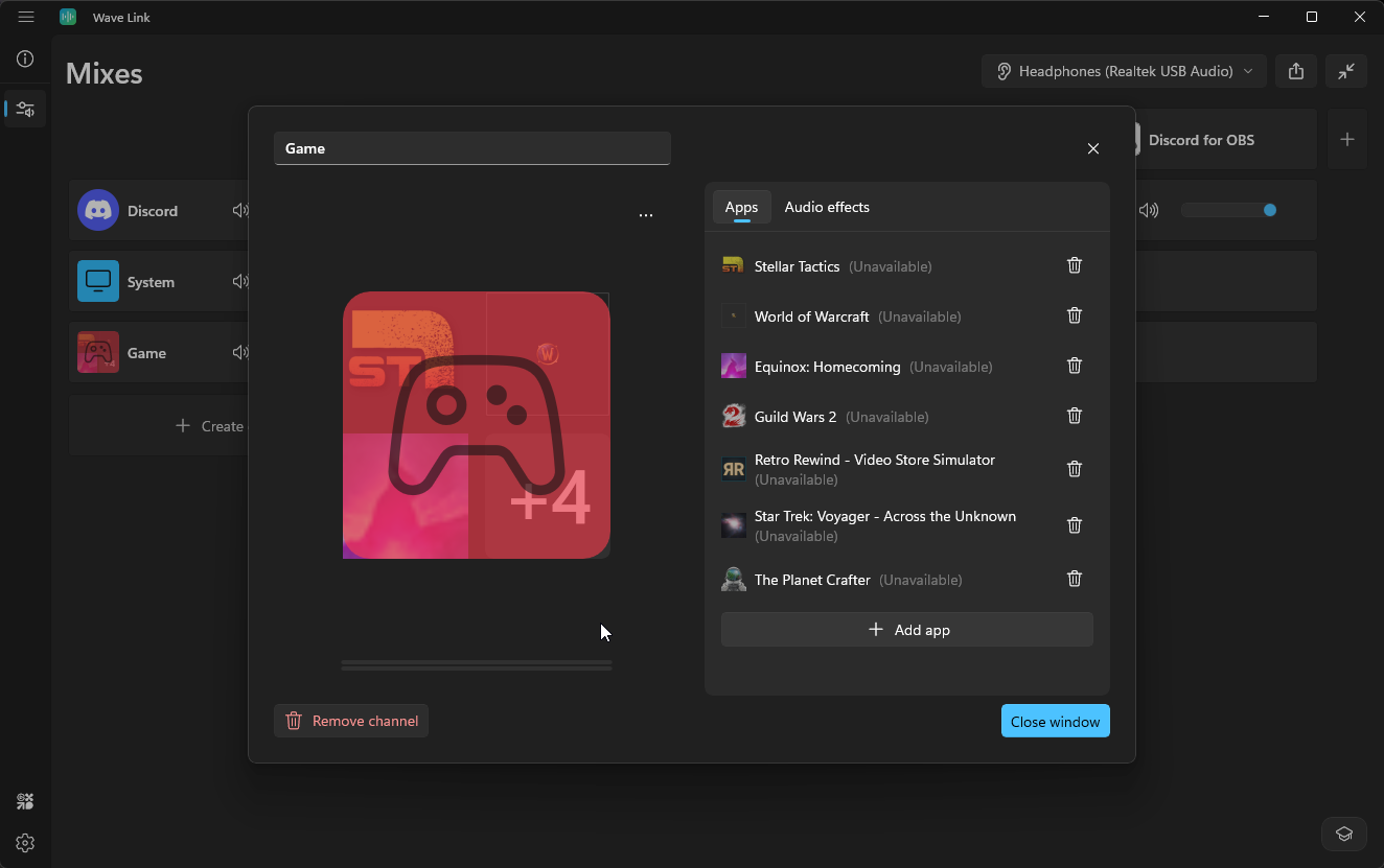 The one curveball is that, while Wave Link allows for the addition of a mic as an input, I don’t use it. The reason Wave Link includes it, I think, is so that the broadcaster/recorder can monitor the mic’s input. For me, hearing my voice in my own ears a millisecond after I speak is disorienting, but if that’s your thing then Wave Link can add any mic as an input. I have assigned the mic as the native inputs within Discord and OBS, since the mic is dedicated to those apps whenever I’m using either one. I suppose that if you have VST audio filters that you want to apply to a mic (and Wave Link will read and make available any VSTs you have installed) then adding the mic as an input is what you’ll want to do.