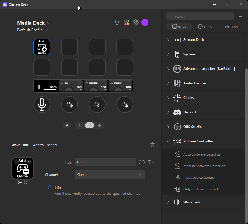 In my current, unfinished setup shown above, I have the second, third, and fourth dial controls set to control the IEM, Desktop, and Discord dedicated outputs. The dials on the SD+ have two actions: twist and click. Twisting the knob will control the volume of that output, while clicking the knob will mute that output. This is essential as I want to have a game’s audio piped through the Desktop output when I’m not recording or in Discord voice, but I don’t want it through the soundbar when recording or chatting. I can simply click the knob to mute the Desktop output when I only want audio through the IEMs, or vice versa. I also have a direct mic control assigned to the first knob so I can mute the mic when needed (although I’m considering turning that into a button and assigning the Wave Link’s Game output to a dial).