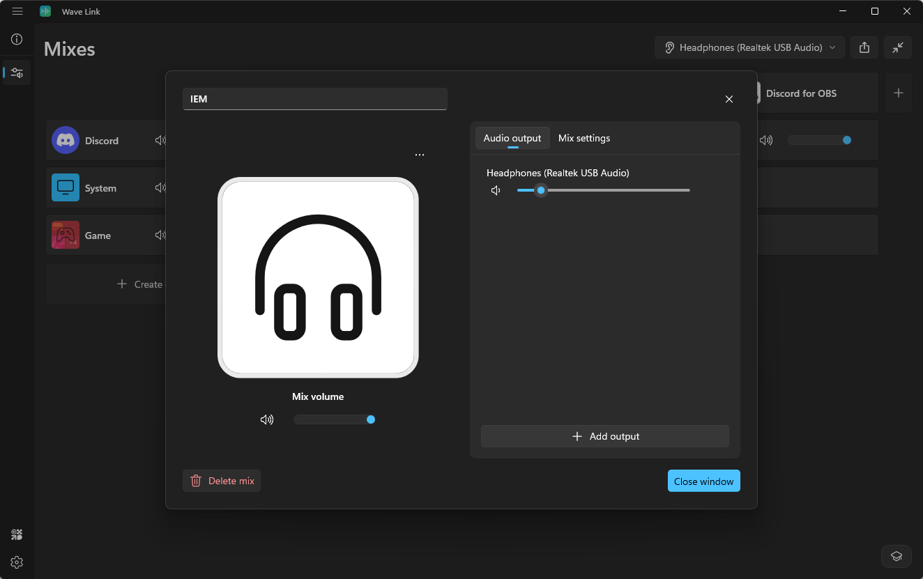 Each audio out can be set to send to a specific known hardware output. In my case, I have three available: the Desktop output, the IEM output, and my Razer Blackshark headset. I opted to create one output per device that I use (the Blackshark has been “retired” as the IEMs sound better and are more comfortable).