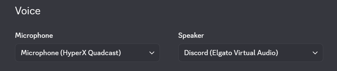 Wave Link is a free app available from Elgato’s website. The gist is that I have set up audio sources as rows, and audio outputs as columns. In the screenshot above, I have Discord, System, and Game as audio inputs. Defining an audio input is entirely under my control; I can make as many of them as I need. After making a Discord input, I used Discord’s “Voice & Video” settings within the app to use the newly available “Discord (Elgato Virtual Audio)” option for it’s output.