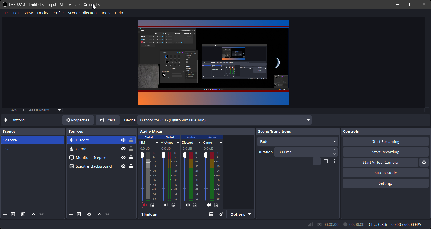 If you’re familiar with setting up audio inputs in OBS, then you might already understand what needs to happen. I’ve added the two dedicated audio outputs from Wave Link into OBS. The Discord channel uses the “Discord (Elgato Virtual Audio)” as it’s source, and the Game channel uses the “Game (Elgato Virtual Audio)” as it’s source.