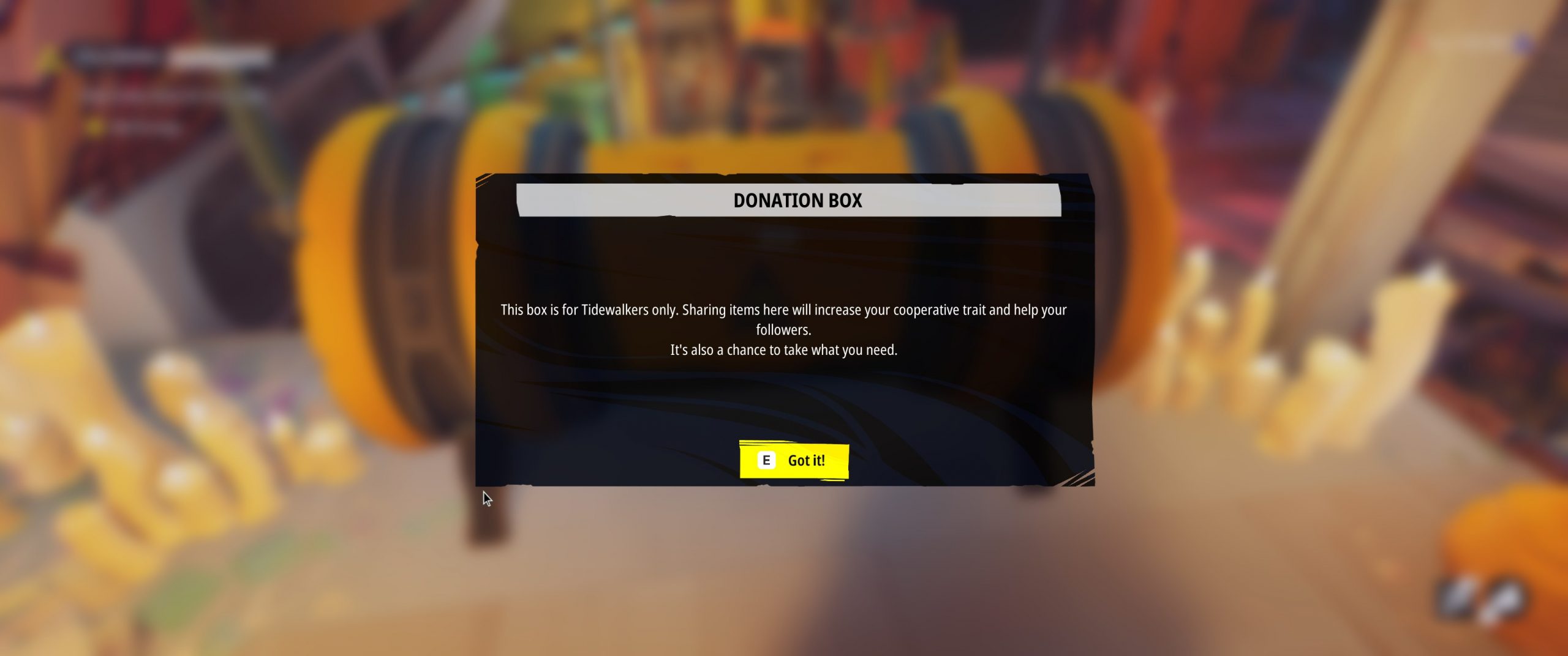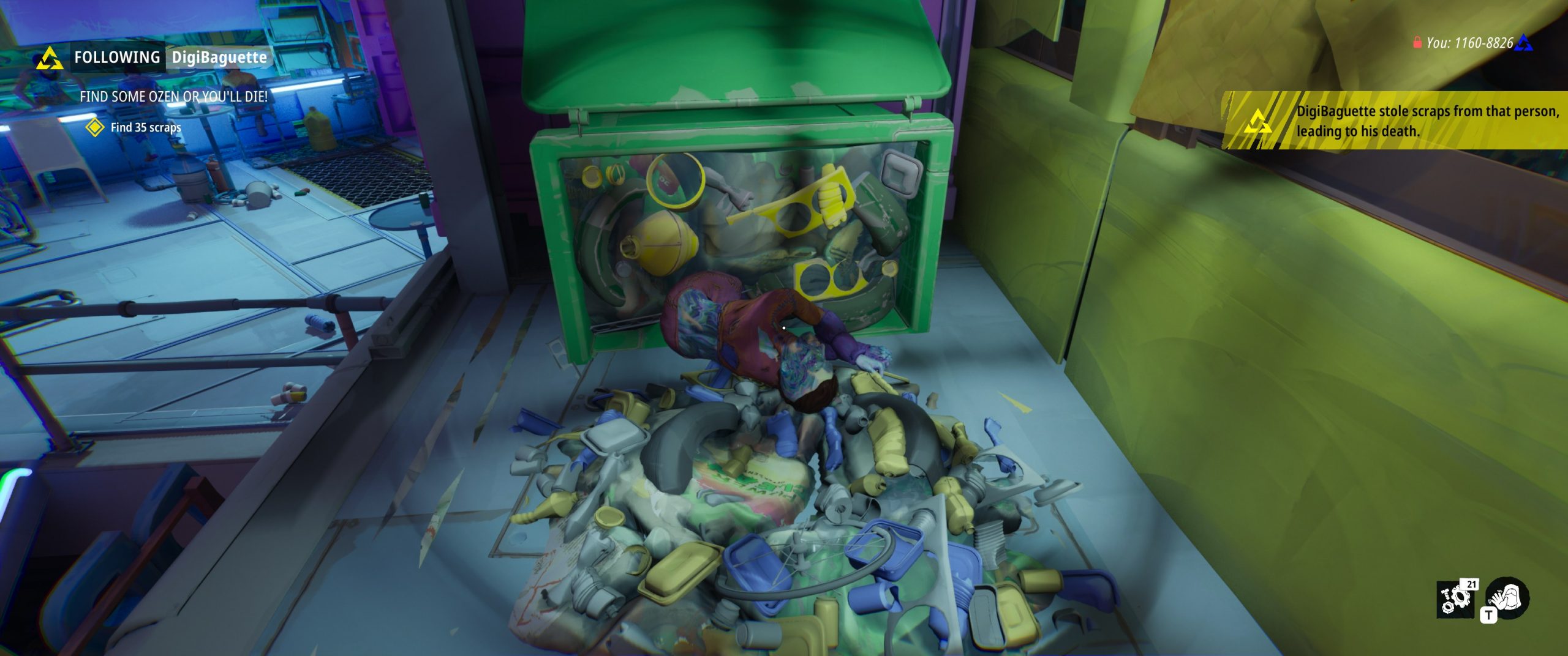 Another feature that uses this system is the “gifting” mechanic. There are chests littered here and there, into which a player can deposit or withdraw scrap or Ozen; depositing helps the next player, while withdrawing takes advantage of the previous player’s generosity. In another case, I had the option to deposit a “tip” of scrap at the Ozen dealer’s shop, and the amount tipped determines how large of a discount on an Ozen purchase the next player will receive, if any.